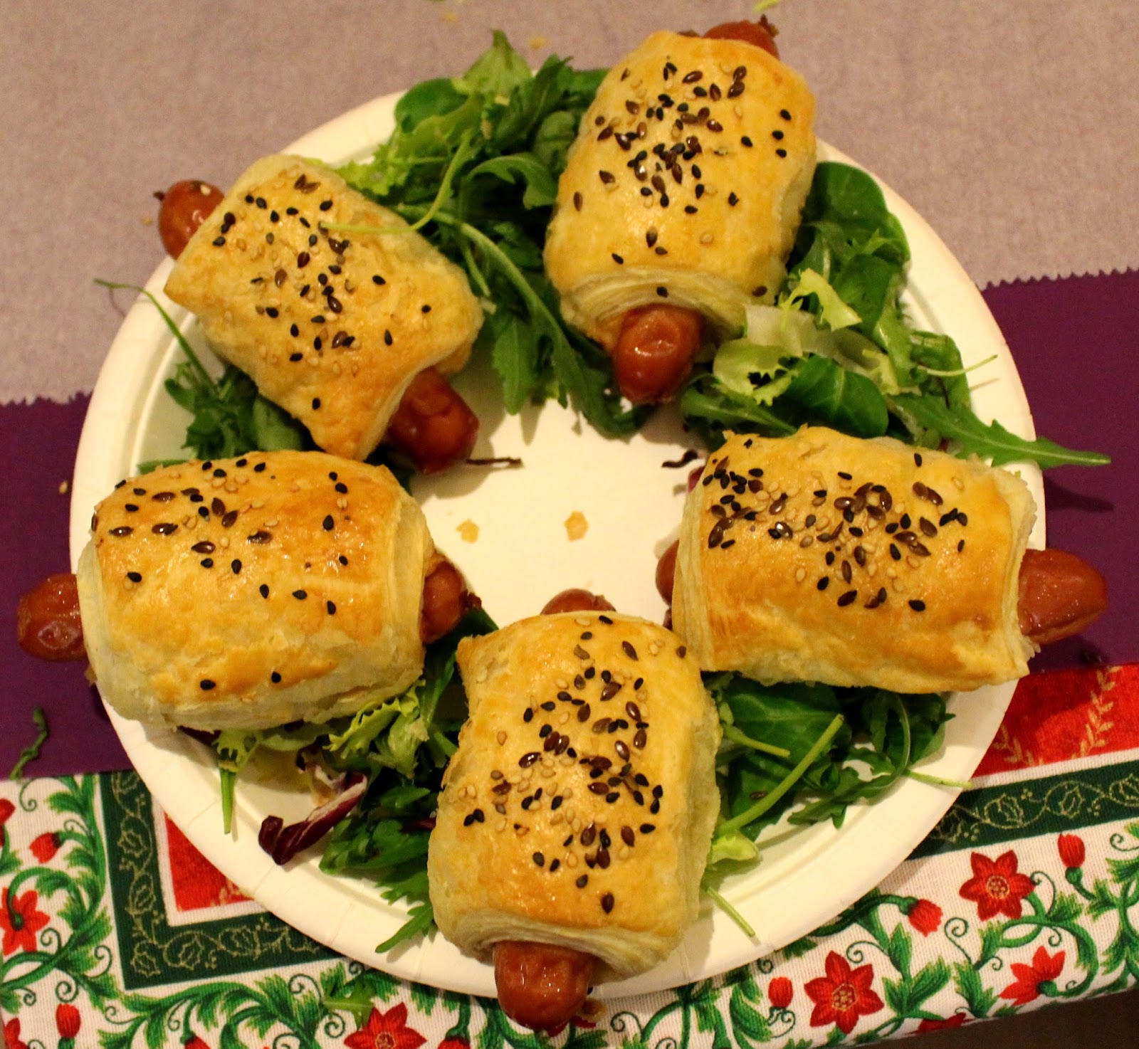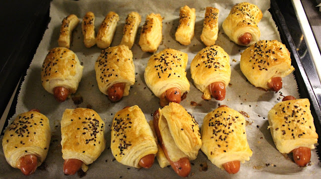 Ripottele siemenillä ja paista uunissa 200 astetta noin 15-20min, kunnes taikina on kaunis ruskea ja nakit kypsiä.
