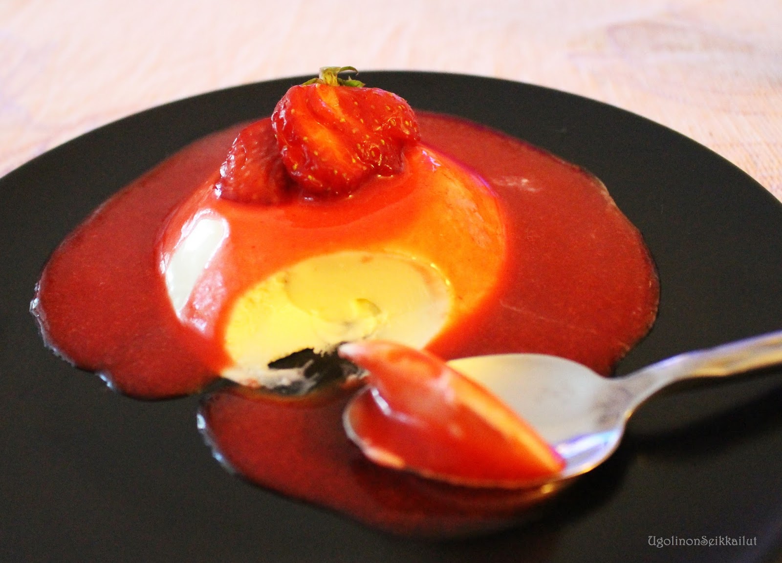 Laita panna cotat lillumaan ihan hetkeksi tulikuumaan veteen niin astian reunat lämpenevät ja panna cotta valuu kauniisti ulos. Tarkkana tämän prosessin kanssa sillä panna cotta voi sulaa jos liian kauan kuumassa vedessä.