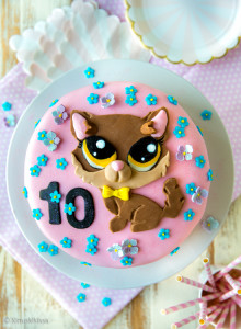 Pääsin tämän kakun kautta tutustumaan Littlest Pet Shop -maailmaan, joka koostuu pienistä eläinhahmoista ja niiden tykötarpeista. Teemana tämä oli täysin omaa luokkaansa, niin valtava oli erilaisten hahmojen kirjo. Onneksi kakun suhteen toive oli hyvin spesifi! Toivotun hahmon kuvan löytäminen netistä oli verrattavissa neulan etsimiseen heinäsuovasta, joten olikin helpompaa ottaa valokuva ja tulostaa se paperille. Sen jälkeen vaiheet etenivät maalaaminen mallikuvan avulla -ohjeen mukaisesti.