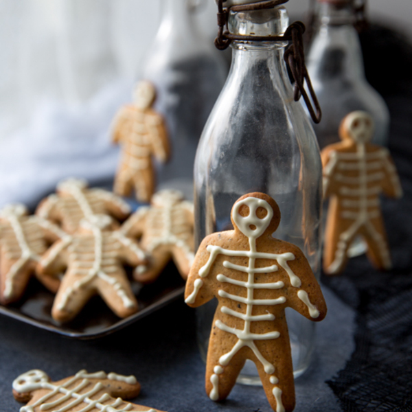 Piparkakku-ukkojen Halloween-look syntyi pursottamalla valkosuklaasta luurangot pipareiden päälle. Valkosuklaan kanssa on oltava tarkkana, sillä suklaa tahriintuu helposti pipareita käsiteltäessä. Pikeeri on hivenen työläämpi, mutta siistimpi vaihtoehto.