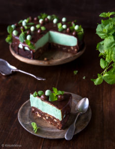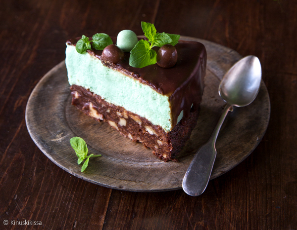 Tämä mintun makuinen hyydykekakku rakentuu suklaisen browniepohjan päälle. Minttutäytteen voi tehdä aidosta yrtistä tai piparminttu-uutteesta. Uute on korvattavissa samalla määrällä piparminttuaromia. Testasin kakun myös gluteenittomana ja se onnistuu vaihtamalla vehnäjauhot yks yhteen gluteenittomaan jauhoseokseen. Reseptin ohesta löydät videon kakun valmistamisesta!