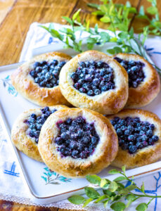 Pullataikinaan leivottu mustikkapiirakka on klassikko, jolla on oma vankka kannattajakuntansa. Itselleni tämä versio on syystä tai toisesta jäänyt vieraammaksi, kunnes toinen tyttäristäni (8 v.) korjasi tilanteen tänä kesänä. Mökillä tyttö kuuli mummin ja vaarin suunnittelevan mustikkametsään lähtöä. Oli tiedossa monta tuntia metsässä tarpomista, mutta tyttö vaati päästä mukaan. Marjat oli poimittava ja sen hän halusi tehdä itse. Itse poimitut mustikat olivat vasta ensimmäinen näytös. Käsikirjoitus oli hahmottunut jo matkalla metsään. Mustikoista hän haluaisi leipoa näitä pieniä mustikkapiirasia. Mallikuvan hän etsi minulle netistä ja resepti suunniteltiin yhdessä. Tytön oma projekti sai hienon ja herkullisen päätöksen ja muisto siitä jää elämään meidän kaikkien mieliin.