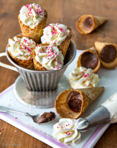Tämän tapaisia uunissa paistettavan leivonnaisen ja jäätelövohvelin yhdistelmiä on näkynyt ulkomaisilla leivontasivustoilla, mutta tekeminen on tyssännyt yhteen asiaan: vohveli on ollut tasaisella pohjalla varustettu kuppi, jollaisia meiltä ei saa. Nyt kuitenkin sain Kinuskiemon kautta käsiini ruotsalaisen Allers-lehden (36/2016), jossa oli hyödynnetty perinteistä kartion mallista vohvelia. Niksinä oli pystyttää vohvelit alempana kuvassa näkyvään asetelmaan kuivakakkuvuokaan. Tämä toimi tosi hyvin ja näin syntyvä mutakakun ja jäätelötötterön risteytys oli mieletön menestys lasteni kaveripiirissä. Pursotin päälle kermavaahtoa, mutta vallan hyvin sen tilalle voisi laittaa perinteisemmän ratkaisun eli jäätelöpallon.