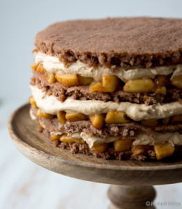 Levitä kostutetun kakkupohjan päälle omenahilloketta ja valkosuklaavaahtoa.