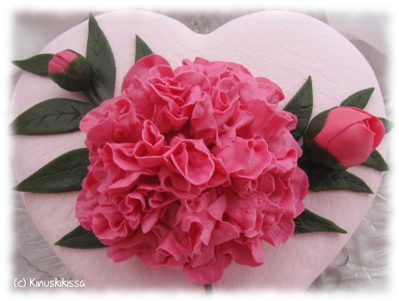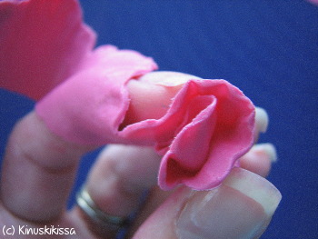 Nuppuja varten pyörittele pienestä sokerimassan-/marsipaaninpalasta pallo (sama väri, josta pionikin oli tehty). Kauli samaa väriä ohueksi levyksi ja ota siitä ruusunterälehtimuotilla terälehtiä tai muotoile terälehdet leikkaamalla levystä leveän pisaran muotoisia paloja. Kieritä n. 3 terälehteä pallon ympärille. Kauli tummanvihreästä marsipaanista levy ja ota siitä n. 2 terälehteä. Kieritä ne nupun ympärille niin, että vihreät lehdet peittävät nupun alaosan.