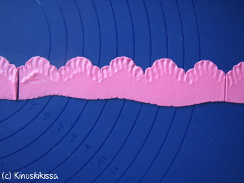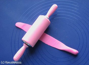 Värjää sokerimassa/marsipaani halutun sävyiseksi: tässä on käytetty Wiltonin Rose-sävyä ja valkoista. Muotoile marsipaanista ohut pitkula ja kauli se hyvin ohueksi nauhaksi. Lopputulos on sitä aidompi, mitä ohuempi nauha on.