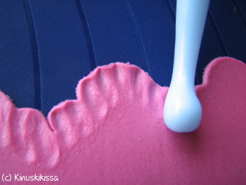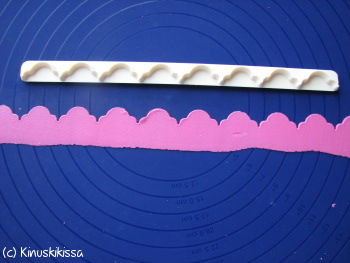 Muotoile marsipaaninauhan toiseen reunaan ulokkeita veitsellä tai esimerkiksi kuvan kaltaisella reunamuotilla. Korkeammat kohdat tuovat valmiiseen kukkaan terälehtien kaltaista vaikutelmaa.