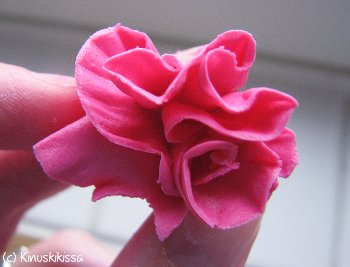 Vinkki: marsipaanin kovettuminen kestää sen verran kauan, että sykeröt saattavat valahtaa hieman alaspäin – kukka ikään kuin nuukahtaa. Voit tökkiä sinne tänne kukan lehtien lomaan pieniä foliopötköjä pitämään kukan muodossaan.