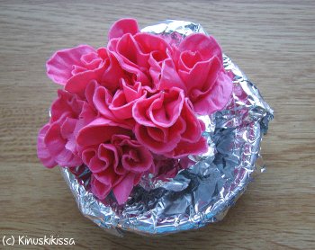 Valitse kuivatusalustaksi pieni, matalareunainen astia ja vuoraa se alumiinifoliolla. Ripottele päälle tomusokeria. Laita kupin keskelle sokerimassa/marsipaanimöykky, johon lähdet kiinnittämään erillisiä sykeröitä sitä mukaa, kun niitä valmistuu. Lopputuloksena on yksi iso kukka. Kuvassa tämä ei tule hyvin esille, mutta marsipaanimöykky saa olla isokin ja pallomainen muodoltaan. Sykeröt tarttuvat kiinni möykkyyn ihan vaan painamalla, ”liimaa” ei välttämättä tarvita. Mitä tiheämmin sykeröitä laitat, sitä näyttävämpi pionista tulee. Tässä valmiin pionin halkaisija oli n. 10 cm.
