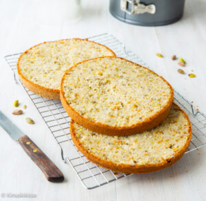 Pähkinäinen kakkupohja on niin herkullinen, että se maistuu ihanalta jopa ilman täytteitä. Pistaasin voi halutessaan korvata myös muulla pähkinärouheella.