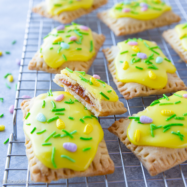 Pop tartseissa ei ole välttämättä kuorrutetta ja niitä tavataan lämmittää leivänpaahtimessa. Minusta värikäs kuorrute on kuitenkin näiden leivosten kruunu, jonka ansiosta niistä voi tehdä joka kerta erilaisia ja soveltaa helposti erilaisiin tilaisuuksiin. Keväiseen herkutteluun sopii hyvin ihanan oranssinen aprikoosihillo, mutta Bonne Mamanin valikoimasta toimivia olisivat myös esimerkiksi appelsiini, mansikka tai karamelli.