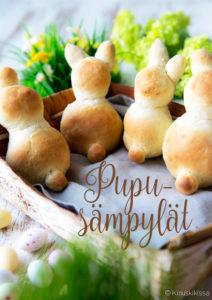 Nyt sämpylöitä leipomaan! Nämä pääsiäispuput leivoin ”herkkuleiväksi” toista tytärtäni ajatellen, joka on erityisen ihastunut pupuihin. Leipomiseen voi ottaa koko perheen mukaan ja keksiä yhdessä uusia ideoita ja versioita pääsiäishahmoista. Tätä taikinaa on nimittäin helppo muovailla. Muutamien tipahtaneiden päiden jälkeen voin kuitenkin sanoa, että parhaiten onnistuvat pellin päälle ”makaamaan” laitetut hahmot.