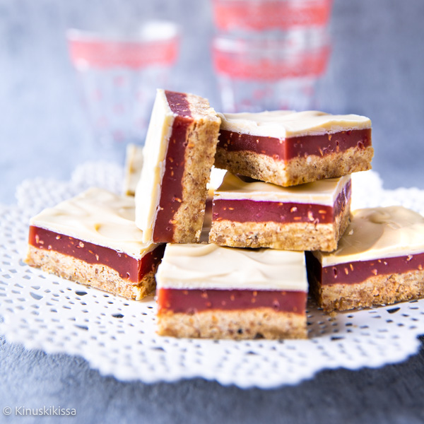 Reseptin taustalla on amerikkalainen millionaire’s shortbread eli miljonäärin leivos, jossa on muropohja, kinuskitäyte ja suklaakuorrute. Tässä leivoksessa on samat rakenteet, mutta maku on Runebergin päivään mukautettu. Leivos toimii hyvin myös ystävänpäivänä, jolloin pinnan voi koristella vaikka sydänrakeilla. Manteliaromin voi jättää pohjataikinasta pois.