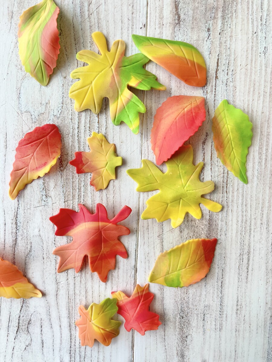 Voit värjätä valkoisen sokerimassan haluamiisi sävyihin tai hyödyntää valmista vihreää ja keltaista. Keltaista voi edelleen sävyttää punaisella värillä oranssiksi ja punaiseksi. Kun käytät massan värjäämisessä kertakäyttöhanskoja, väri ei tartu käsiin.