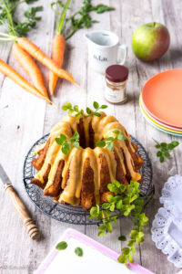 Syyskuu on sadonkorjuun aikaa ja puutarhan antimet ovat leipojankin riemastus. Omena ja porkkana mehevöittävät kakkutaikinaa ihanasti. Lisäjujua antavat juustokakun makuiset raidat.