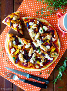 Olen pitkään haaveillut ”gourmet-pizzan” valmistamisesta, jossa kaikki tehdään pitkän kaavan mukaan taikinajuuresta ja tomaattikastikkeesta lähtien. Nyt päätin ottaa haltuun pizzan teon salat. Perinteisen rasvaisen italialaisen pizzan sijaan mietin tarkkaan täytteiden ravintoarvoja. Hyvän olon pizza syntyy broilerin lisäksi maukkaista kotimaisista juureksista ja ihanista yrteistä. Itse asiassa jo täytteet yksistään muodostavat aterian. Jos haluaa skipata pizzaosuuden, aineksista voi tehdä pataruoan, jossa juurekset ja marinoitu broileri kypsennetään uunivuoassa. Kypsennyksen loppuvaiheessa paistoksen voi kuorruttaa juustolla.
