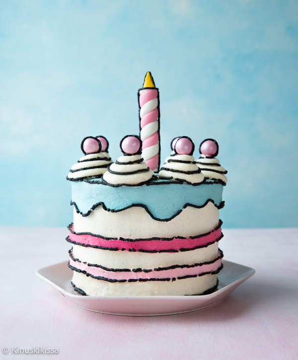 Instagramissa alkoi viime vuoden aikana näkyä sarjiskakkuja (cartoon cake, comic cake). Kyseisen koristelutekniikan ideana on saada kakku näyttämään kaksiulotteiselta piirrokselta. Tyyli on sarjakuvamainen, jossa tussin jälkeä muistuttavat rajaukset reunustavat kaikkia yksityiskohtia. Vaikutelma on onnistunut, jos ei nopealla silmäyksellä tunnista kakkua oikeaksi. 😄