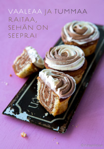 Tein seepramuffinsseja seeprakakkutaikinalla keväällä – hyviä, meheviä ja nättejä! (älkää nyt ristiinnaulitko jos tässä sama taikina – en jaksanut tarkistaa onko mitä eroja) Täytyy vain ihmetellä tuota raitojen säännöllisyyttä, ja tekemisen siisteyttä. Olethan retusoinut kuvauspaikan olethan..? 🙂