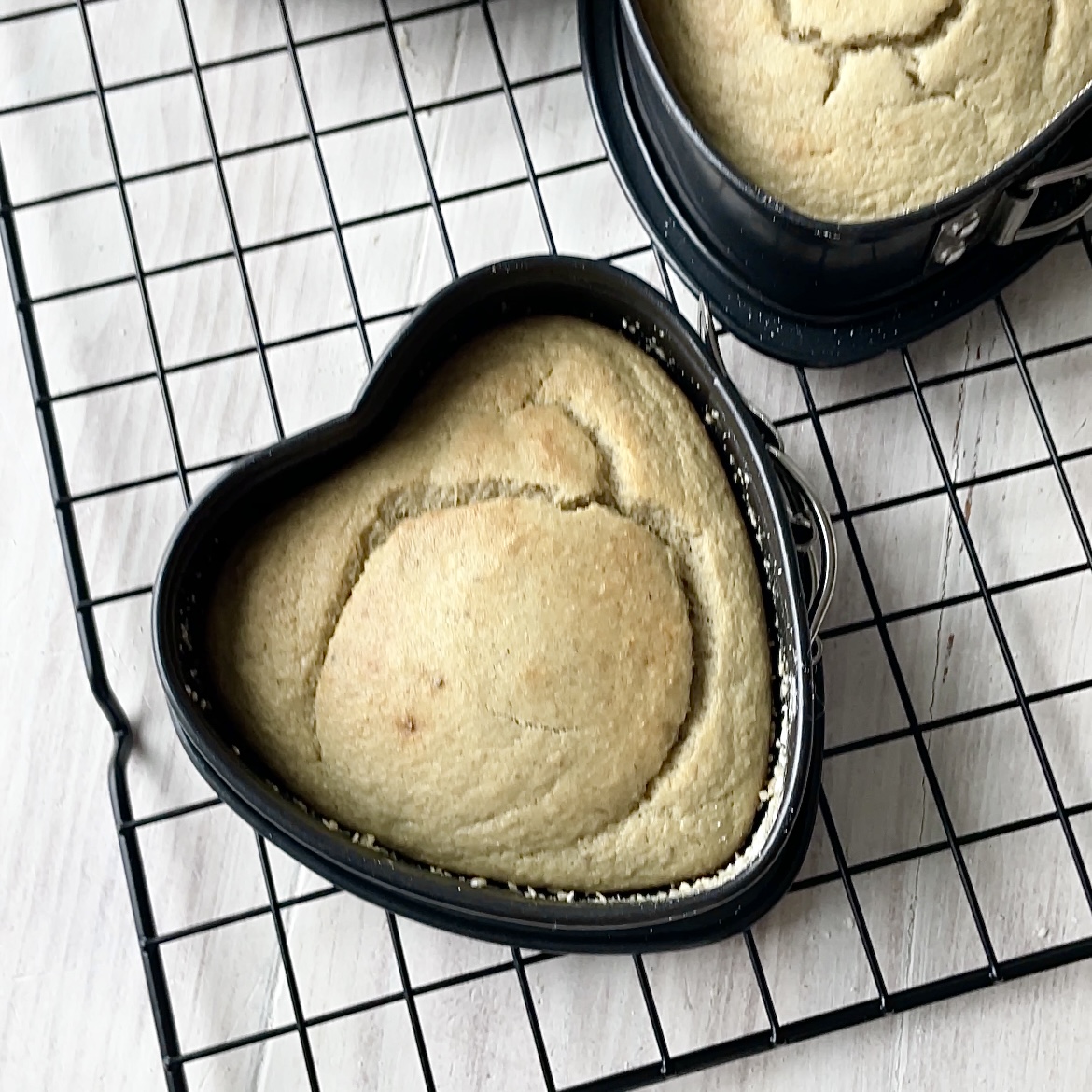 Taikinaa laitetaan vuokaan vain niin vähän kerrallaan, että siitä paistuu yksi kerros. Näin varmistetaan kakkupohjan tasainen kypsyminen. Tarvitset siis kolme vuokaa tai sitten joudut paistamaan jokaisen kerroksen erikseen. Huomaathan, että käytetty vuoka on minikokoinen. Yksi vaihtoehto on hieman isompi vuoka ja vain kaksi kerrosta. Hyödynnä suunnittelussa vuokien muunnostaulukkoa (linkki ainesluettelon yhteydessä) sekä reseptin laskuria.