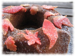 Reseptin julkaisuvuonna 2008 kuvasin kakun ruskalehdillä koristeltuna. Sittemmin päivitin uuden kuvan leivottuani kakun uudessa vuoassa. Kun käytät laadukasta vuokaa, pelkkä voitelu riittää ja kakku suorastaan hyppää vuoasta.