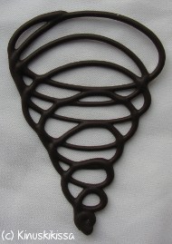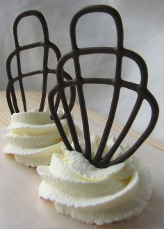 - Pursotusvälineet. Välineet ovat tottumuskysymyksiä, mutta minä käytän tarkkoihin pursotuksiin aina pientä pursotuspussia, liitintä ja kirjoitustyllaa, koska mielestäni pursotussetillä saa parhaan pursotusvarmuuden. Tyllan aukon on syytä olla tällaisissa koristeissa 1-2 mm. Pussin toinen pää kannattaa sulkea tiiviisti pussinsulkijalla, jotta suklaa ei pääse valumaan yläkautta ulos. (Liitinohjeessa kuvia pursotusvälineistä.) Pursotuksiin, joissa ei vaadita täydellisen tarkkaa jälkeä, käy pakastuspussikin, jonka kulmaan voi leikata tarvittavan kokoisen aukon.