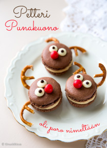 Halusin hakea koristeluun vähän uudenlaista ideaa, mutta lopulta en osannut valita, kumman teeman toteuttaisin. Tein siis molemmat! Kultaisella kimallesuihkeella viimeistellyissä glamour-macaroneissa on luksusta ja selkeä juhlan tuntu. Nämä hupaisat poro-macaronit sopivat kepeämpään tilaisuuteen, kuten pikkujouluihin.