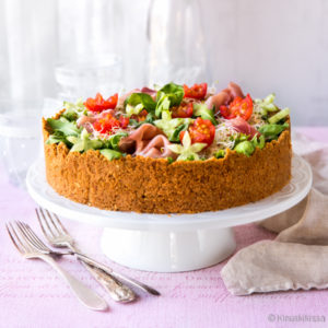 Makean täyteläinen amerikkalainen juustokakku on tuttu juttu, mutta suolainen versio siitä on uudempi tuttavuus. Tämä juuston ystävän suolapala haastaa voileipäkakun juhlapöydässä. Se tarjoillaan kylmänä ja kannattaakin valmistaa jo tarjoilua edeltävänä päivänä. Juustoisen täytteen päälle rakennetaan kakun toinen pääelementti eli raikas ja runsas salaatti. Tätä leivonnaista voisikin nimittää myös salaattikakuksi, jossa tuoreet kasvikset tarjoillaan juhlavasti. Voit kokeilla täytteessä muitakin Viola makuja yhdistellen erilaisiin salaattiaineksiin.