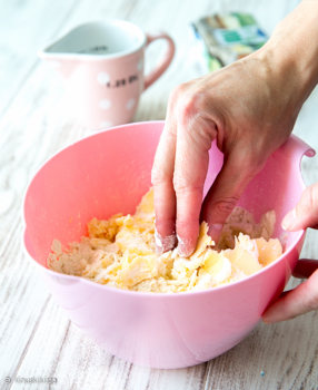 Sekoita kuivat aineet keskenään ja nypi sekaisin voin kanssa. Lisää joukkoon vesi.