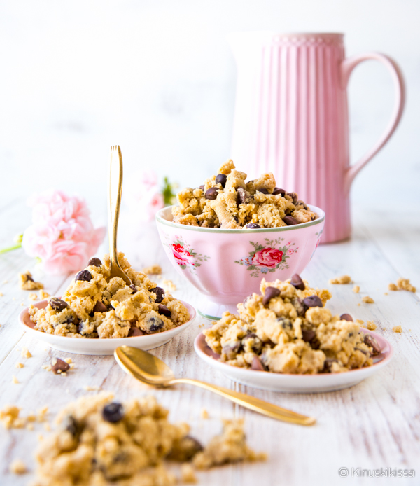 Raakaa taikinaa olen toki käyttänyt resepteissä aiemminkin. Helpoiten nämä ohjeet löytää käyttämällä hakusanaa cookie dough. Herkkävatsaiset kuitenkin saattavat saada oireita raa’an taikinan syömisestä. Siksi tässä ohjeessa käytetään pientä hämäystä: jauhot kypsennetään erikseen. Myöskään kananmunaa ei käytetä.