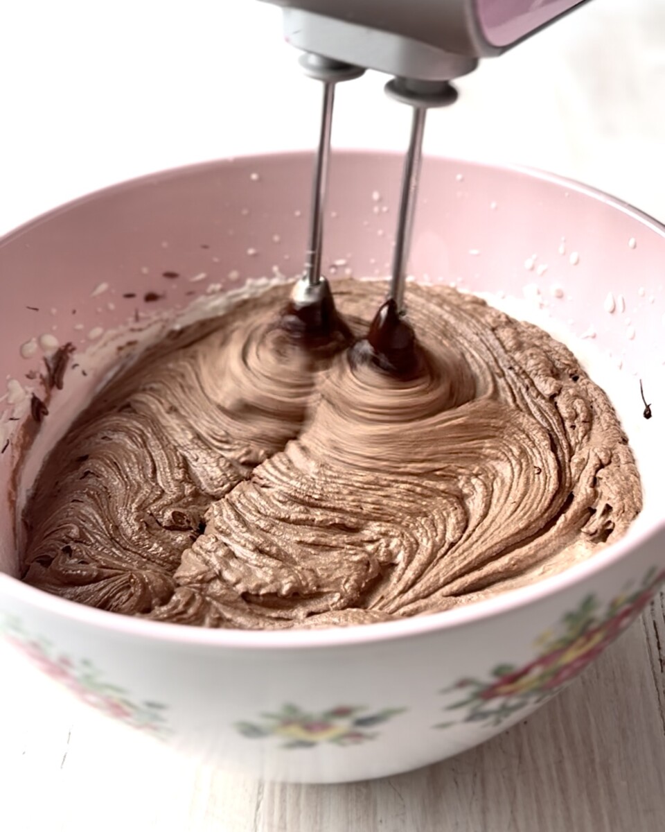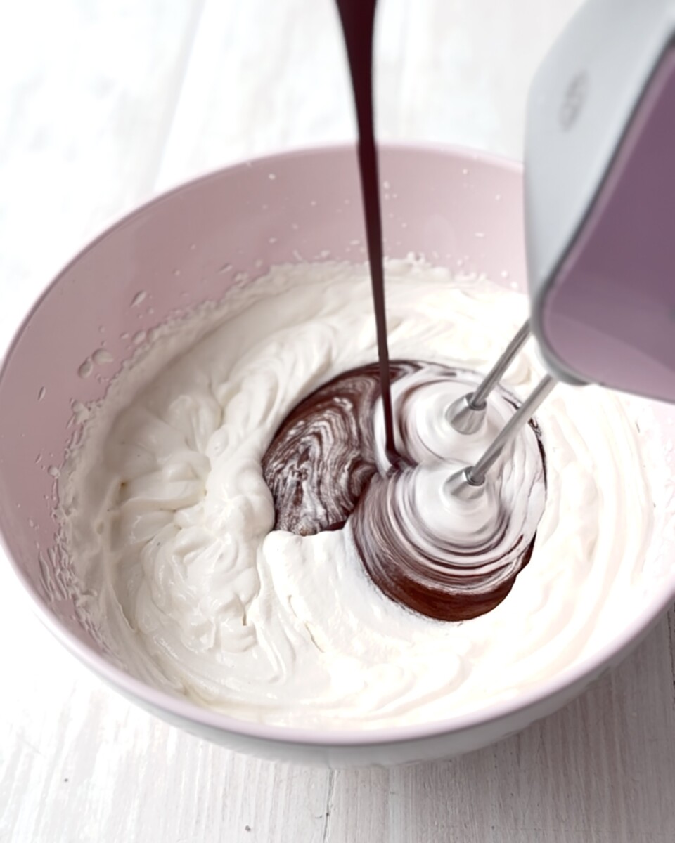 Sitten yhdistetään suklaa kermavaahtoon. Oikea sekoitustekniikka on onnistumisen avain. Kaada suklaasula vaahdon joukkoon samalla, kun vatkaat rauhallisesti. Suuntaa suklaasula suoraan vatkaimiin, jotta se sekoittuu nopeasti ja tasaisesti. Jos suklaasula ehtii jähmettyä ennen sekoittumista, vaahtoon voi jäädä pieniä suklaaraepisteitä.