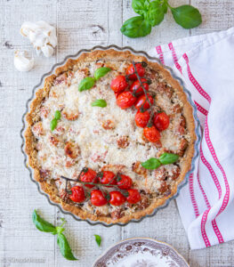 Meidän perheen juhlissa tästä piirakasta on tehty useita versioita, joista yksi on melko lähellä tätä tomaatti-mozzarellapiirakkaa. Tuon piirakan erikoisuutena on, että parmesaani tulee pohjan päälle (eli täytteen alle). Jos haluaa piirakalle todella tomaattisen ulkonäön, niin voit toki soveltaa tätäkin ohjetta samaan tapaan.