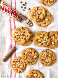 Chocolate chip cookieiden perheeseen on kiva kehitellä uusia makuja, koska tästä parhaasta suklaakeksiohjeesta on moneksi! Tällä kertaa yhdistin keksit ja lempisuklaan. Osa hipuista on siis korvattu Twixistä leikatuilla paloilla. Tässä voit toki käyttää omia suklaasuosikkejasi ja saat näin hyvinkin helposti muovattua reseptiä omaan suuntaan. Olennaista on huomata, että biitit painellaan valmiiden keksien päälle. Niitä kun ei ole tarvetta kypsentää ja keksien ulkonäköstäkin tulee näin näyttävämpi.