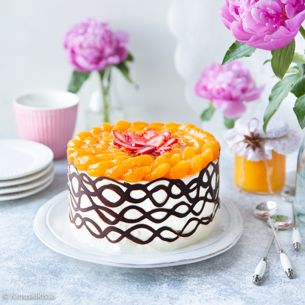 Nyt juhlitaan arvokkaasti klassisella hedelmätäytekakulla! 🧡 Hedelmistä ja kermavaahdosta muodostuva kuorrute on raikas ja herkullinen. Suklaareunuksella saat kermavaahtoreunaan näyttävän, pitsimäisen vaikutelman. Voipohjaista unelmatorttutäytettä on kevennytty vaniljakreemillä ja raikastettu omatekoisella appelsiinihillolla. Kreemitäyte antaa kakulle tarvittavan napakkuuden.