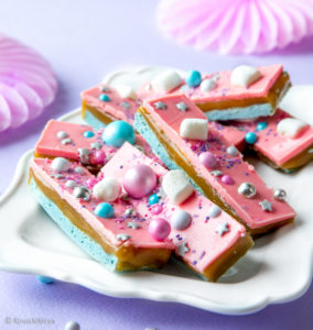 Unicorn- eli yksisarvisteema on ollut jo monta vuotta pinnalla ja unicorn-kakku on yksi Kinuskikissan suosituimpia lastenkakkuja. Tämän teeman täydennykseksi kehittelin unicorn-leivokset, joiden väritys on ihanan satumainen: sininen pohja, vaaleanpunainen kuorrute ja välissä toffeeta. Myös vaahtokarkit ja erilaiset värikkäät koristeet kuuluvat unicorn-maailmaan. Nyt ei säästellä nonparelleissa!