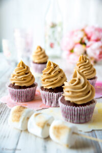 Nuotiolla grillattujen vaahtokarkkien makuun pääsee paahtamalla vaahtiksiin uunissa rapean ja tumman pinnan. Sisältä pehmenneet vaahtokarkit sulatetaan kermaan, joka myöhemmin vatkataan vaahdoksi. Näin vaahtokarkeista syntyy ihana, pursotettava kuorrute. Tässä reseptissä se kruunasi suklaamuffinssit.
