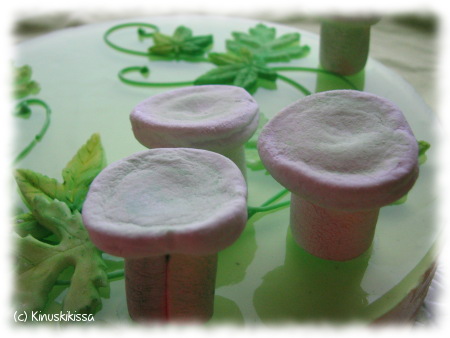 Leikkaa kannaksi tulevasta vaahtokarkista hieman pituutta pois. Paina hattu kiinni tähän leikkuupintaan. Sieni on valmis! Jos sommittelet sienirykelmän, tee eri korkuisia sieniä – näin saat aidomman vaikutelman. Kiinnittäessäsi sieniä kakkuun voit käyttää apuna kaupan sokerikuorrutetta.