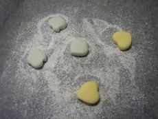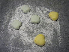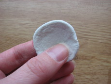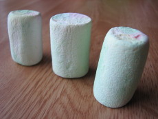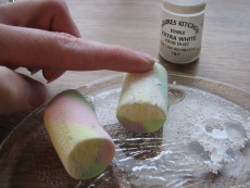 Valitse Väiski-pussista sileäpintaisia vaahtokarkkeja. Halutessasi peittää vaahtokarkkien hennot pastellisävyt voit sivellä pintaan tomuväriä. Tässä on käytetty valkoista tomuväriä.