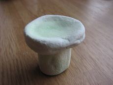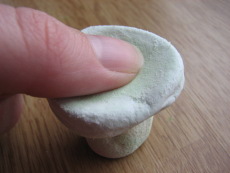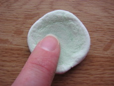 Käännä jäähtyneet vaahtokarkit ympäri. Siloita sormellasi kääntöpuolen pinta ja sivele siihen halutessasi tomuväriä. Kivan näköisiä sieniä syntyy laittamalla hatun keskiosaan tummempaa sävyä, tässä esimerkissä hentoisesti vihreää.