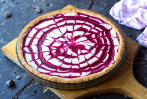 Seepran voi tehdä muistakin marjoista sokerin määrää sopivasti säätäen. Minä kokeilin vadelmaa – siitäkin tuli todella ihanaa. Vedin pintaan muodostuneet renkaat rikki kevyillä viilloilla marmorikuvion aikaansaamiseksi. Näyttävä kuviointi lisää piirakan juhlavuutta.