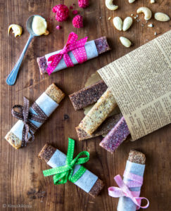 Vuosi sitten innostuin vertailemaan kaupan välipalapatukoita ja totesin harmikseni, että hyvää tuotetta oli vaikeaa löytää. Kriteereinä oli mm. eri ainesosien suhde (monissa tarpeettomankin iso osuus hedelmää), (piilo)sokerit sekä tietenkin maku ja rakenne. Siitä lähtien on ollut tarkoitus kehitellä oma resepti ja tässä sitä ollaan. 🙂 Valittavanasi on viisi erilaista makuvaihtoehtoa ja lisää voit keksiä itse. Kerro mieluusti kommentissa, jos keksit hyviä!