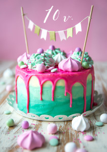 Uskomatonta mutta totta, pienet kääröni viettivät joulun alla jo ensimmäisiä pyöreitä vuosiaan! Synttäreitä juhlistettiin tällä kakulla. Aikaisempina synttäreinä tytöt ovat saaneet esittää toiveen synttärikakkunsa teemaksi. Tällä kertaa he kuitenkin antoivat minun suunnitella kakun alusta loppuun – vain lempivärit (toisella vaaleanpunainen/pinkki, toisella turkoosi/mintunvihreä) tulivat annettuina. Intouduin jatkamaan joulun alla julkaistun suklaaputouskakun tekniikalla. Valuva kuorrute toimii hyvin myös värillisenä, kun sen tekee valkosuklaasta ja värjää sen mieleisekseen.