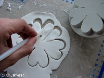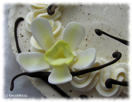 Kauli valkoinen sokerimassa tomusokeroidulla alustalla n. 1 mm paksuksi levyksi. Ota kuvioita muotilla. Vaniljankukkiin ei löydy valmista muottia, mutta voit hyödyntää muita muotteja. Tässä on käytetty lumpeenkukkamuottia. Leikkasin terälehdet kahdeksi irralliseksi lehdeksi. Voit käyttää myös sydänmuottia eli halkaista sydämen kahdeksi terälehden muotoiseksi kappaleeksi.