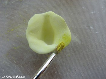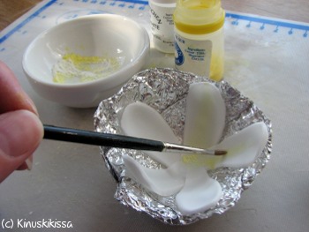 Sekoita keltaisesta ja valkoisesta tomuväristä vaaleankeltainen väriseos. Tupsuttele sitä terälehtien keskiosaan.