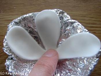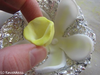 Muotoile alumiinifoliosta kuppi kukan kuivattamista varten. Laita sokerimassapallukka kupin pohjalle ja painele irralliset terälehdet (yht. 5 kappaletta) siihen. Käytä tarvittaessa liimana sokerikuorrutetta.