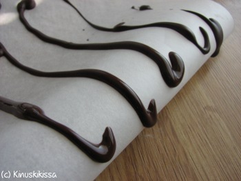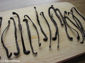 Vaniljatangot voi tehdä Brunbergin tummasta suklaasta. Paloittele suklaa ja sulata se mikrossa miedolla lämmöllä. Laita suklaa pursotuspussiin, jossa on 2-3 millin kokoinen pyöreä tylla. Voit käyttää pursotukseen myös pakastuspussia, jonka kulmaan leikkaat vastaavan kokoisen aukon.