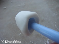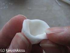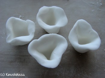 Kukkien keskelle tulevat ”kupit” teet seuraavasti: Pyörittele käsissäsi sokerimassapallo. Paina palloa työkalulla siten, että se painuu pallon sisään ja pallosta muotoutuu pieni kuppi. Ohenna kupin ulkoreunoja sormillasi ja käännä niitä samalla ulospäin.