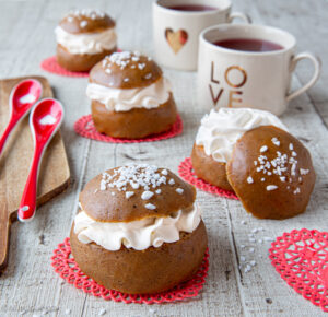 Täydellinen joulupulla syntyy, kun pehmoinen pulla kuorrutetaan raa’alla piparkakkutaikinalla. Herkkukerrointa lisätään täytteeksi pursotetulla vaahdolla. Laskiaispullan jouluinen versio kannattaa kokea! Mikä parasta, onnistut leipomaan tämän ihanuuden täysin vegaanisena. Tämä resepti toimii hyvin myös joulun jälkeen pakastimeen jääneen piparitaikinan hyödyntämiseen.