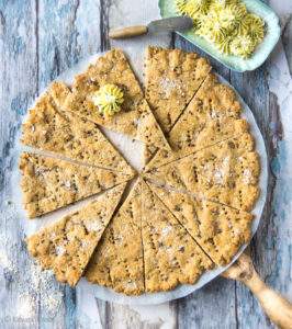 Ystäväni noudatti jonkin aikaa sitten vehnätöntä ruokavaliota, minkä vuoksi perehdyin itsekin vehnättömiin resepteihin suunnitellessani hänelle sopivia tarjoiluita. Tämä kaurarieska oli menestys, eikä se mielestäni jäänyt vehnää millään lailla kaipaamaan. Muutoinkin tein monia ohjeita yksinkertaisesti vaihtamalla vehnäjauhot kaurajauhoihin aivan hyvällä menestyksellä. Kaurajauhoja löydät ruokakaupasta esimerkiksi gluteenittomasta hyllystä. Yrttivoi maistuu levitteenä ja on juhlava, kun sen tarjoilee pursotettuina ruusukkeina.