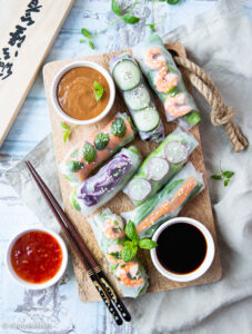 Aloittelijan vinkkinä voisin mainita, että yhteen rullaan täytteitä kannattaa laittaa maltilla – usein aluksi niitä tulee laitettua liikaa. Tyypillisesti rullaan tulee muutamaa eri kasvista ja ainakin yksi muu ”pääraaka-aine”, kuten kala- tai lihatuote. Rullat syödään dippaamalla esimerkiksi soijakastikkeeseen tai itse tehtyyn maapähkinädippiin.