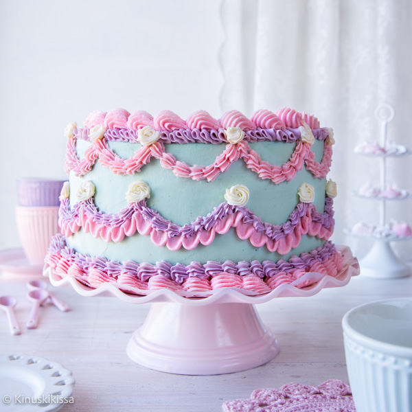 Upea vintage-kakku loistaa kahvipöydän koristeellisena kruununa. 👑 Vintage-kakkutrendi haastaa leipojan testaamaan erilaisia tylloja ja sommittelemaan röyhelöiset ja runsaat pursotukset. Kakusta leivotaan korkea, sillä pursotukset painottuvat kakun sivureunoille. Tästä kakusta syö isompikin vierasjoukko! Tuhdin sokerikreemipinnan vastapainona täytteinä hurmaavat sitruunaiset ja hedelmäiset maut.